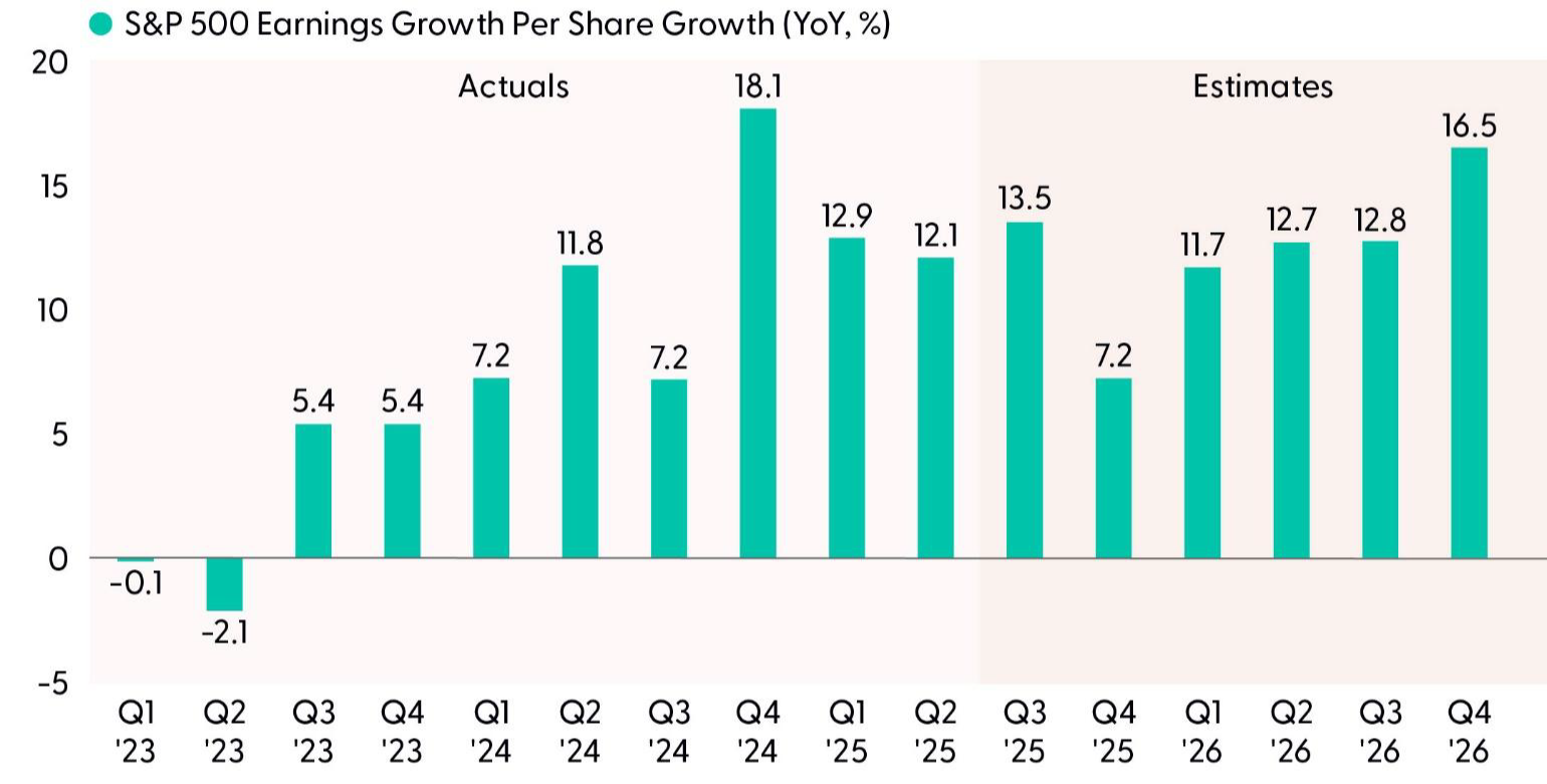 Going forward, the combination of AI-driven productivity, supportive fiscal policy, and easing trade uncertainty is expected to propel continued strong earnings growth, especially if mega-cap tech continues its spending splurge. With a lot of optimism priced into stock prices, corporate America did its part. Strong earnings momentum continues to support equities.